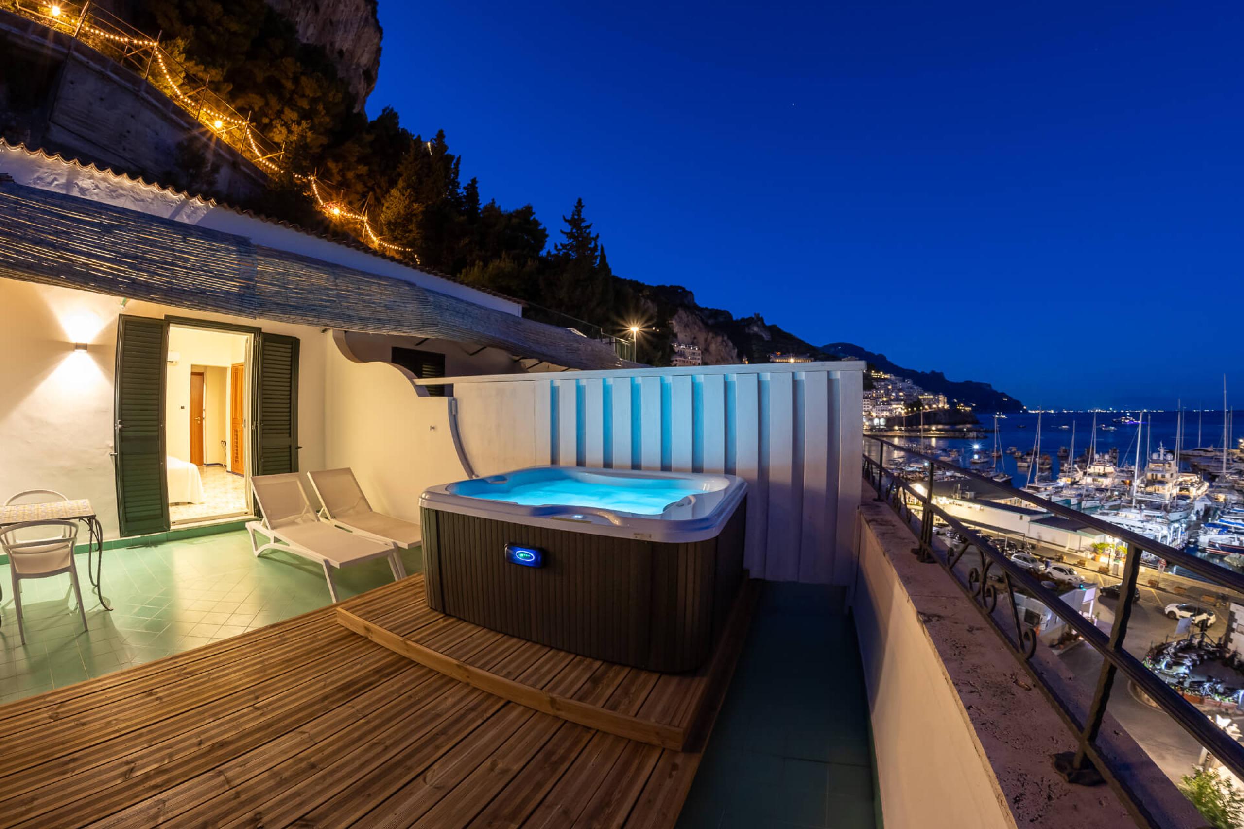 The deluxe room is our best room, located on the top floor with a large terrace overlooking the sea furnished with tables and sun loungers. The absolute highlight: the jacuzzi for two.